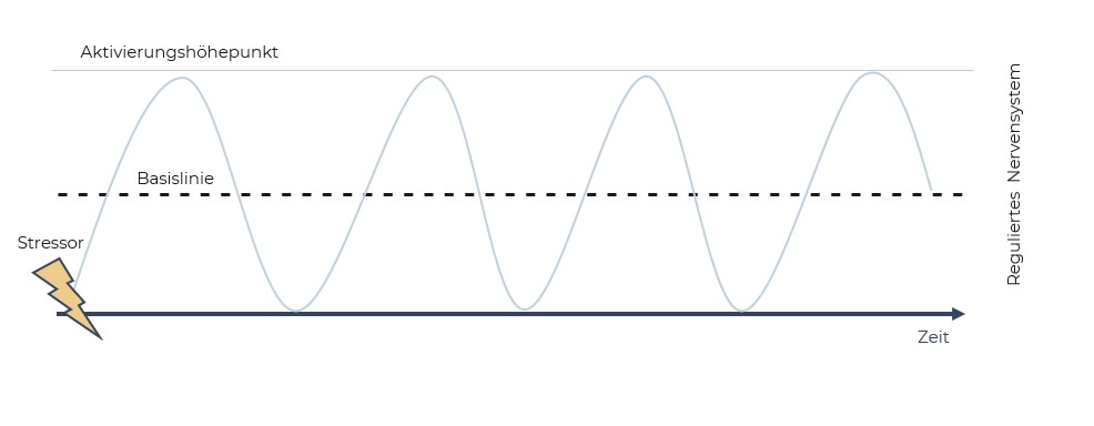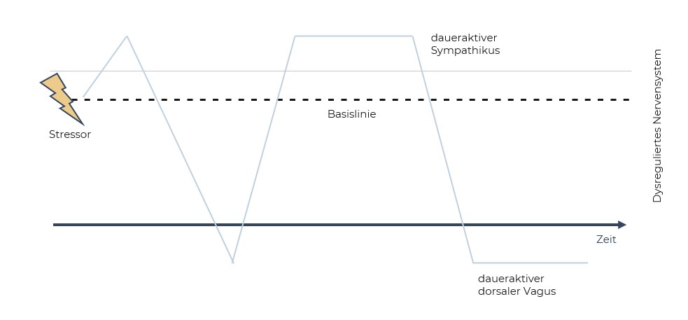 Im Falle eines dysreguliertem Nervensystems verschiebt sich unsere innere Basislinie. Statt in einem gesunden Wechsel zwischen Aktivierung (Sympathikus) und Entspannung (ventralen Vagus) zu pendeln, bleibt das Nervensystem dauerhaft in einem Zustand der Übererregung (Sympathikus) oder Erstarrung (dorsaler Vagus) stecken. Diese Verschiebung der Basislinie ist meist das Ergebnis langfristiger Dysregulation. Denn das Nervensystem passt sich immer an jenen Zustand an, in dem es sich am häufigsten befindet – im Falle einer verschobenen Basislinie zum Beispiel Dauerstress, Anspannung oder emotionale Unsicherheit.