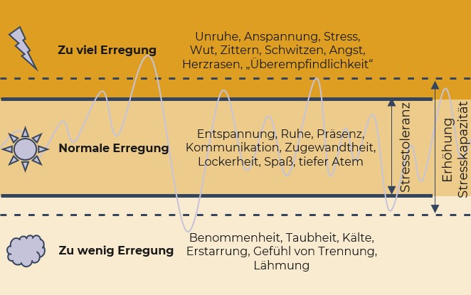 Das Modell des Stresstoleranz-Fensters veranschaulicht auf einfachem Wege unsere individuelle Kapazität mit Stress umzugehen. Immer dann, wenn sich unser Nervensystem in einem ausbalancierten Zustand befindet – wir uns also weder übermäßig angespannt fühlen noch das Bedürfnis haben, uns völlig zurückzuziehen – befinden wir uns im Rahmen unseres Stresstoleranz-Fensters. In diesem Zustand fühlen wir uns sicher/präsent, sehen Handlungsoptionen und sind dazu in der Lage, rational zu denken und soziale Kontakte zu knüpfen. Bewegt sich unser Nervensystem außerhalb unseres Stresstoleranz-Fensters, kann es entweder zu einer Übererregung (z.B. Unruhe, erhöhte Reizbarkeit, Anspannung) oder zu einer Untererregung (z.B. Taubheit, Gefühl des Getrenntseins, Rückzug) kommen.